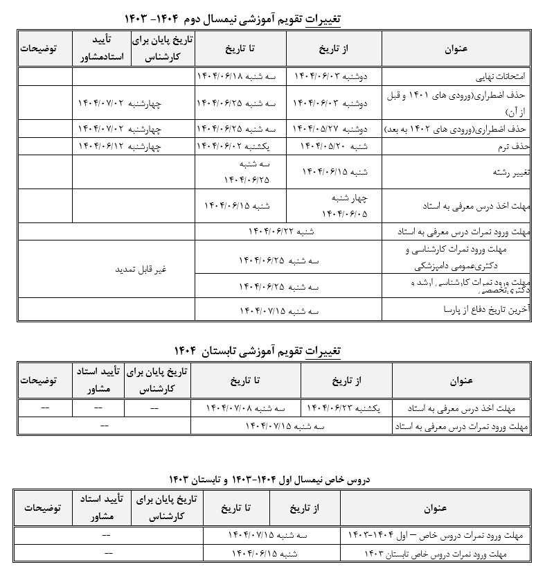 - مهلت ورود نمرات دروس خاص تابستان 1403 و نیمسال اول 1404-1403